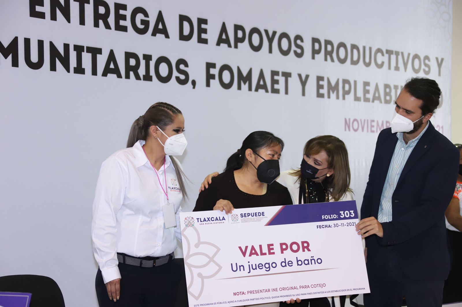 La gobernadora Lorena Cuéllar Cisneros realizó la entrega de apoyos productivos y comunitarios, así como del Fondo para la Creación y Apoyo de Microempresas Artesanales y Actividades Agropecuarias del Estado de Tlaxcala (Fomaet) y Empleabilidad, a través del Servicio Nacional de Empleo (SNE) y el Sistema Estatal de Promoción del Empleo y Desarrollo Comunitario (Sepuede), con el objetivo de beneficiar a pobladores de los sectores más vulnerables.