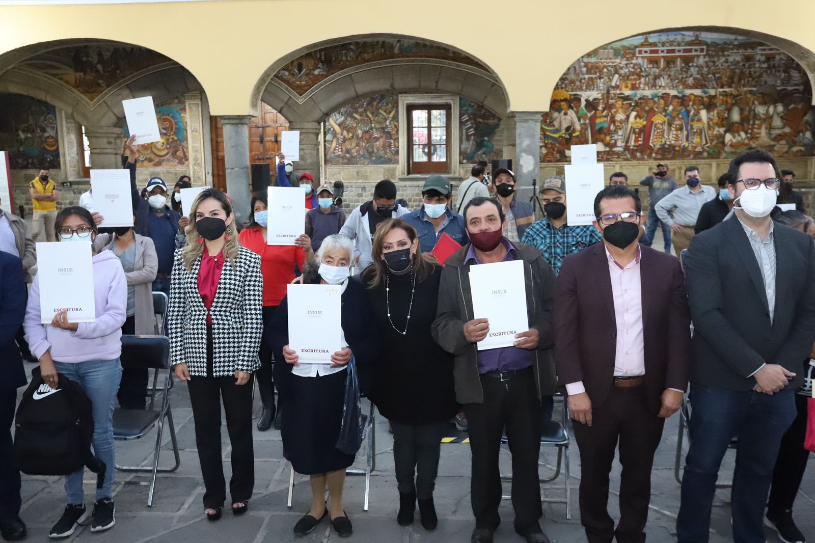 En el Patio Central de Palacio de Gobierno, la mandataria estatal dijo que es un privilegio ver los resultados de los programas que hacen realidad el acceso a una mejor vida para las familias tlaxcaltecas, pues “gracias al Programa de Regularización de Escrituras y la coordinación entre el Insus y la Secretaría de Desarrollo Agrario, Territorial y Urbano (Sedatu) de Tlaxcala, estamos otorgando la certeza jurídica y patrimonio de los beneficiarios, con absoluta seriedad y compromiso”.