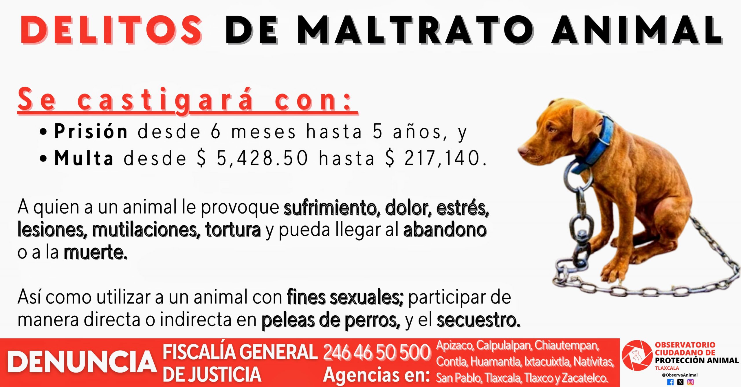 Sigue siendo necesario que se le comunique a los tlaxcaltecas, que los actos de maltrato o crueldad en contra de cualquier animal doméstico, o de los considerados como de trabajo o producción, ya son una infracción que debe ser penada. Esta difusión es posible, por la labor que realizan medios de comunicación socialmente responsables en la entidad.