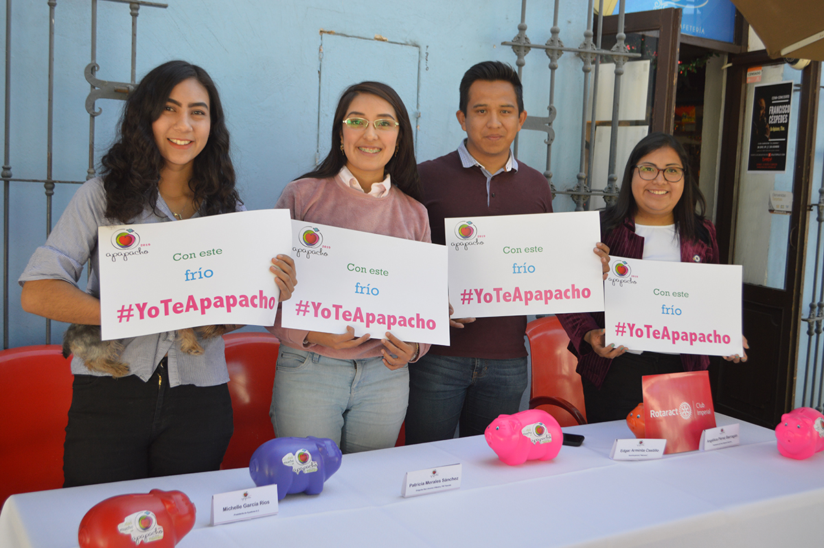 Tlaxcala, Tlax; 15 de diciembre de 2019 (Pulso) En coordinación, las asociaciones civiles “Ayudona”, “Red Jóvenes X México”, ”Club Rotaract Imperial” y la empresa “Sabrosón”, arrancaron la campaña “Apapacho” en su edición 2019, que hace referencia a la palabra en náhuatl que significa acariciar con el alma, cuyo objetivo radica en brindar apoyo a personas en situación vulnerable con la donación de cobijas en comunidades pequeñas que en ocasiones por su accesibilidad en sus vías de comunicación y conexiones con su cabecera, quedan fuera de las políticas públicas dejándolas inevitablemente en el rezago social, explicó Patricia Morales Sánchez coordinadora.