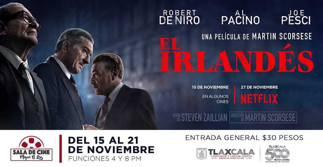 Tlaxcala, Tlax; 15 de noviembre de 2019 (Pulso) La Sala de Cine «Miguel N. Lira» se suma a la proyección de la película “El Irlandés” de Martin Scorsese, antes de su estreno a nivel mundial en la plataforma Netflix.