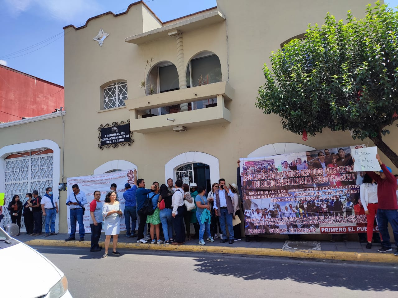 Tlaxcala, Tlax; 9 de mayo de 2023 (Selene Sosa) Este martes extrabajadores administrativos y de base del Colegio de Bachilleres del Estado de Tlaxcala (COBAT) se manifestaron pacíficamente frente a la sede del Tribunal de Conciliación y Arbitraje (TCyA) del Estado de Tlaxcala, para solicitar una audiencia con el responsable, Miguel Ángel Tlapale Hernández, a fin de agilizar sus denuncias.