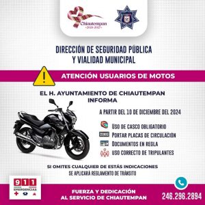 Chiautempan, Tlax; 26 de noviembre de 2024 (PulsoRed) La Presidencia Municipal de Chiautempan hace un atento llamado a conductores de vehículos y motocicletas para cumplir con la normatividad legal y así evitar sanciones o infracciones.