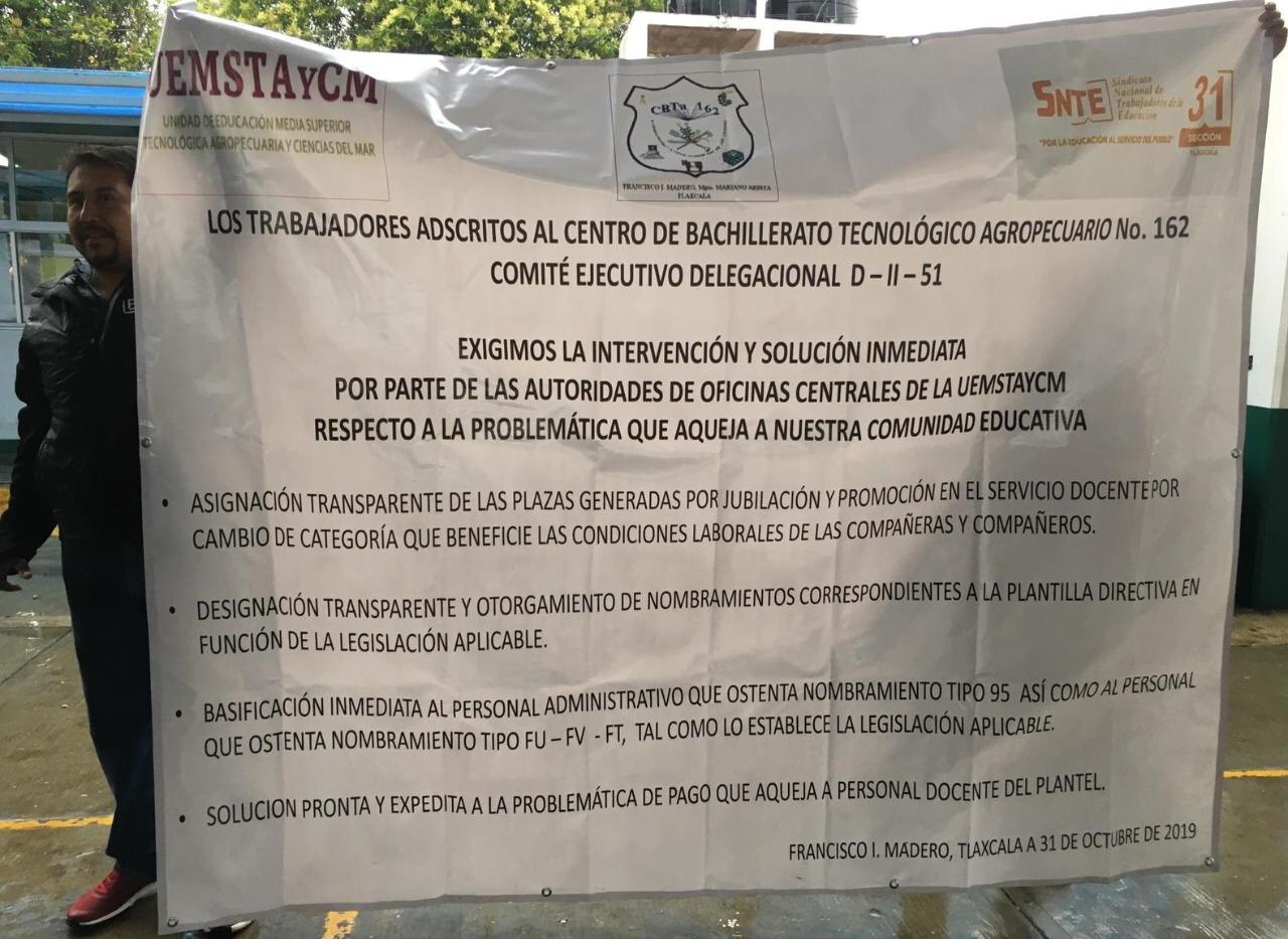 Nanacamilpa, Tlax. 31 de octubre de 2019 (Rommel Pichardo) Este día trabajadores y docentes adscritos al Centro de Bachillerato Tecnológico Agropecuario (CBTA) número 162 ubicado en la comunidad de Francisco I. Madero del municipio de Nanacamilpa, cerraron el acceso del plantel en exigencia de transparencia en la asignación de plazas, las cuales han sido generados por jubilación, promoción en servicio por cambio de categoría y basificación a personal administrativo, además de pedir mejoras de las condiciones laborales, por lo que demandaron la intervención inmediata de las autoridades centrales de este sistema de nivel media superior.
