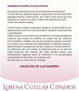 Tlaxcala, Tlax; 10 de mayo de 2025 (PulsoRed) La gobernadora Lorena Cuéllar Cisneros felicitó a las madres tlaxcaltecas en este día especial de celebración del 10 de Mayo, fecha en la que se conmemora la labor que realiza una madre.