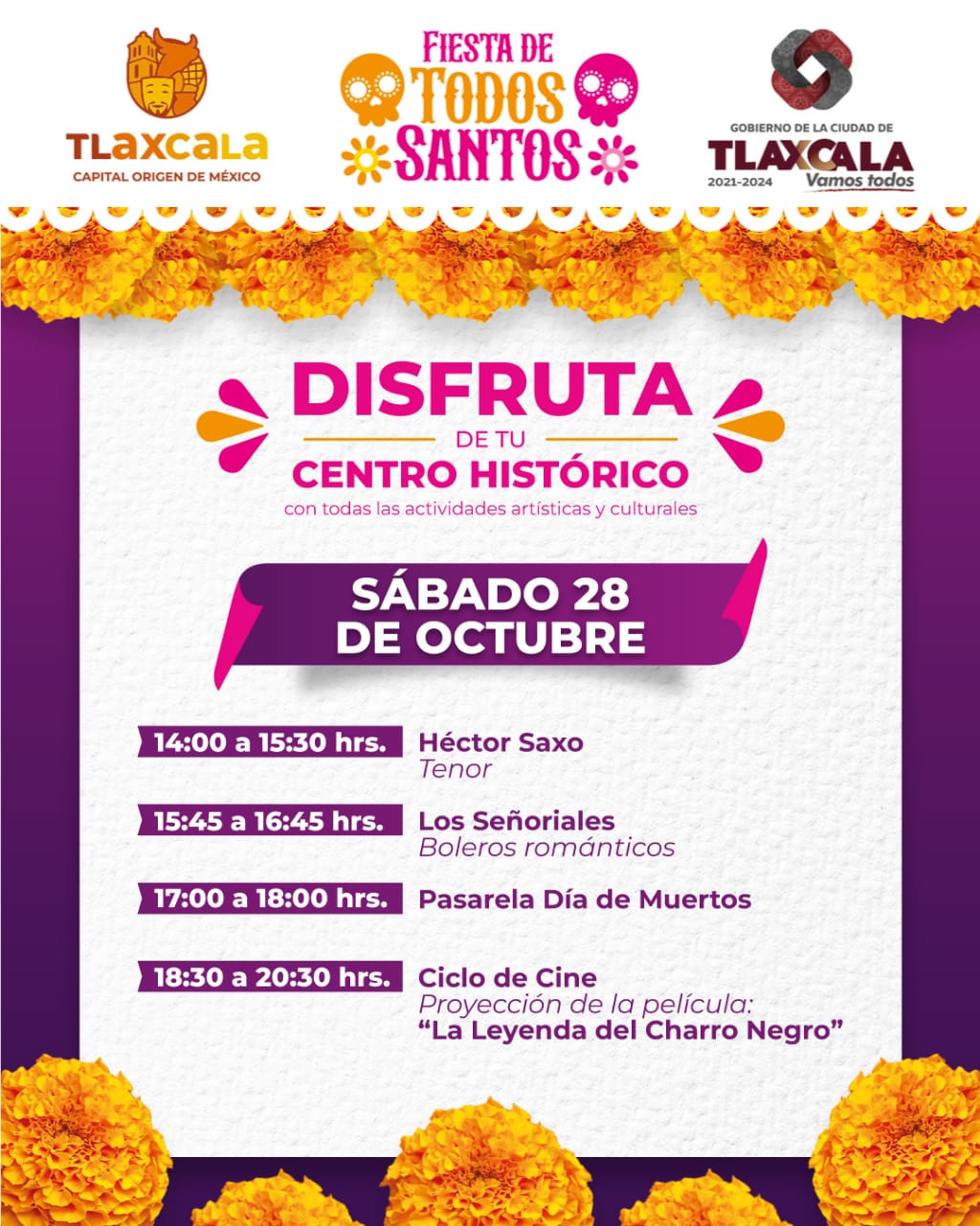 Este sábado en la actividad en el escenario de la Plaza de la Constitución incicia a las 14:00 horas con el tenor Héctor Sax; a las 15:45 boleros románticos con los Señoriales; a las 17:00 horas pasarela de moda artesanal con motivo de Día de Muertos, con modelos de GM Academia y cierra actividades la proyección de la película, «La Leyenda del Charro Negro»