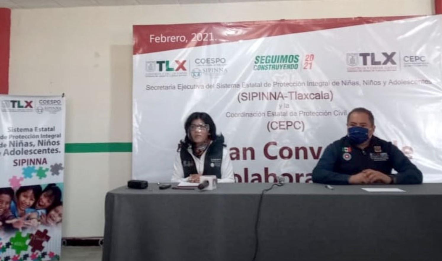 Tlaxcala, Tlax; 20 de febrero de 2021 (Pulso) El Sistema Estatal de Protección Integral de Niñas, Niños y Adolescentes (Sipinna) y la Coordinación Estatal de Protección Civil (CEPC) firmaron un convenio de colaboración con la finalidad de impartir cursos de capacitación en materia de Derechos Humanos y Protección Civil dirigidos a servidores públicos de ambas dependencias.