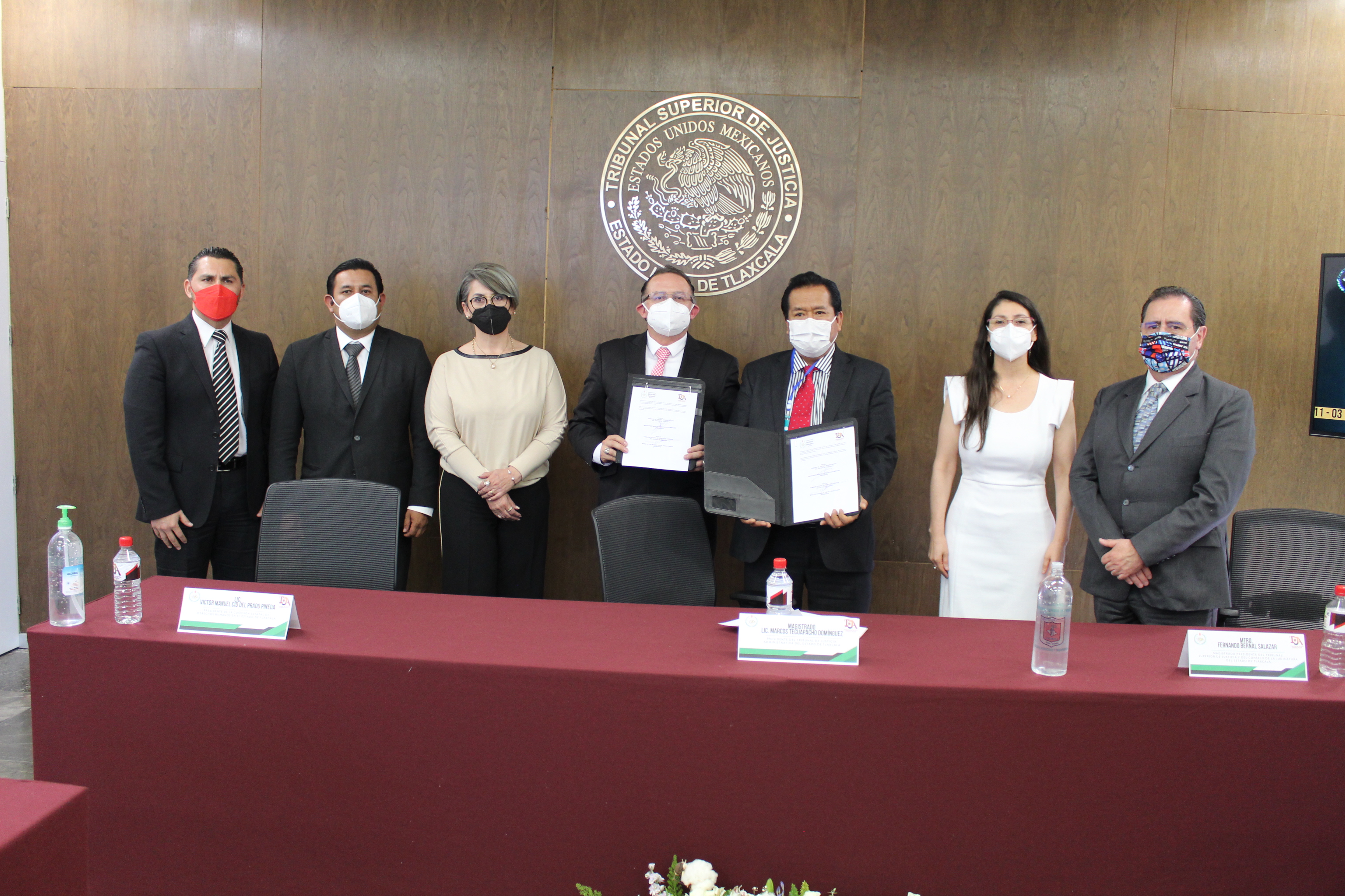 El documento también lo firmó el Presidente del TSJE, Fernando Bernal Salazar; la Magistrada del TJA, María Isabel Pérez González; el Magistrado del TJA, Elías Cortés Roa; la Secretaria Ejecutiva de la CEDH, Jacqueline Ordoñez Brasdefer; y el Director del Instituto de Estudios Especializados e Investigación en Justicia Administrativa del TJA, Jesús Zúñiga González.