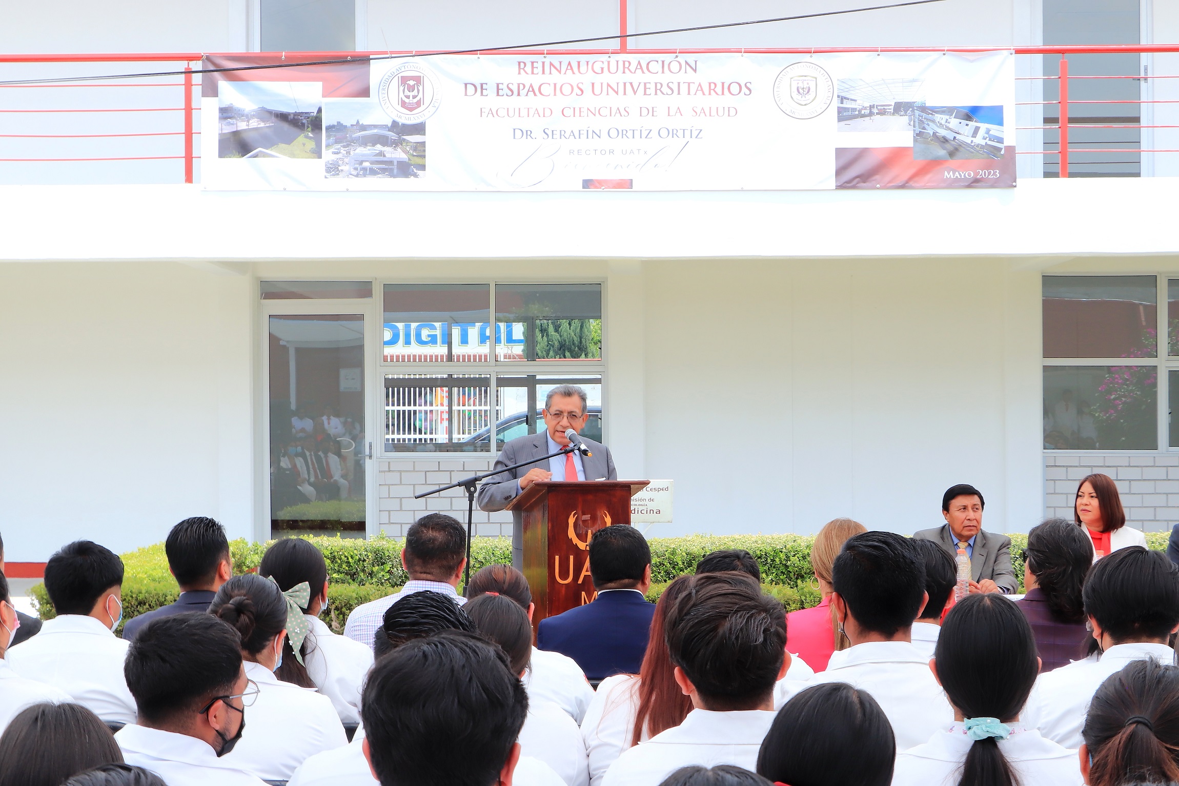 Tlaxcala, Tlax; 9 de mayo de 2023 (PulsoRed) El Doctor Serafín Ortiz Ortiz, Rector de la Universidad Autónoma de Tlaxcala (UATx), presidió el acto de reinauguración de espacios físicos de la Licenciatura en Médico Cirujano, que se imparte en la Facultad de Ciencias de la Salud, que incluye ocho salones, una sala de cómputo, aula multimedia, cafetería y cuatro domos, evento que reunió a la comunidad académica y estudiantil, así como a personal de imagen de esta área.