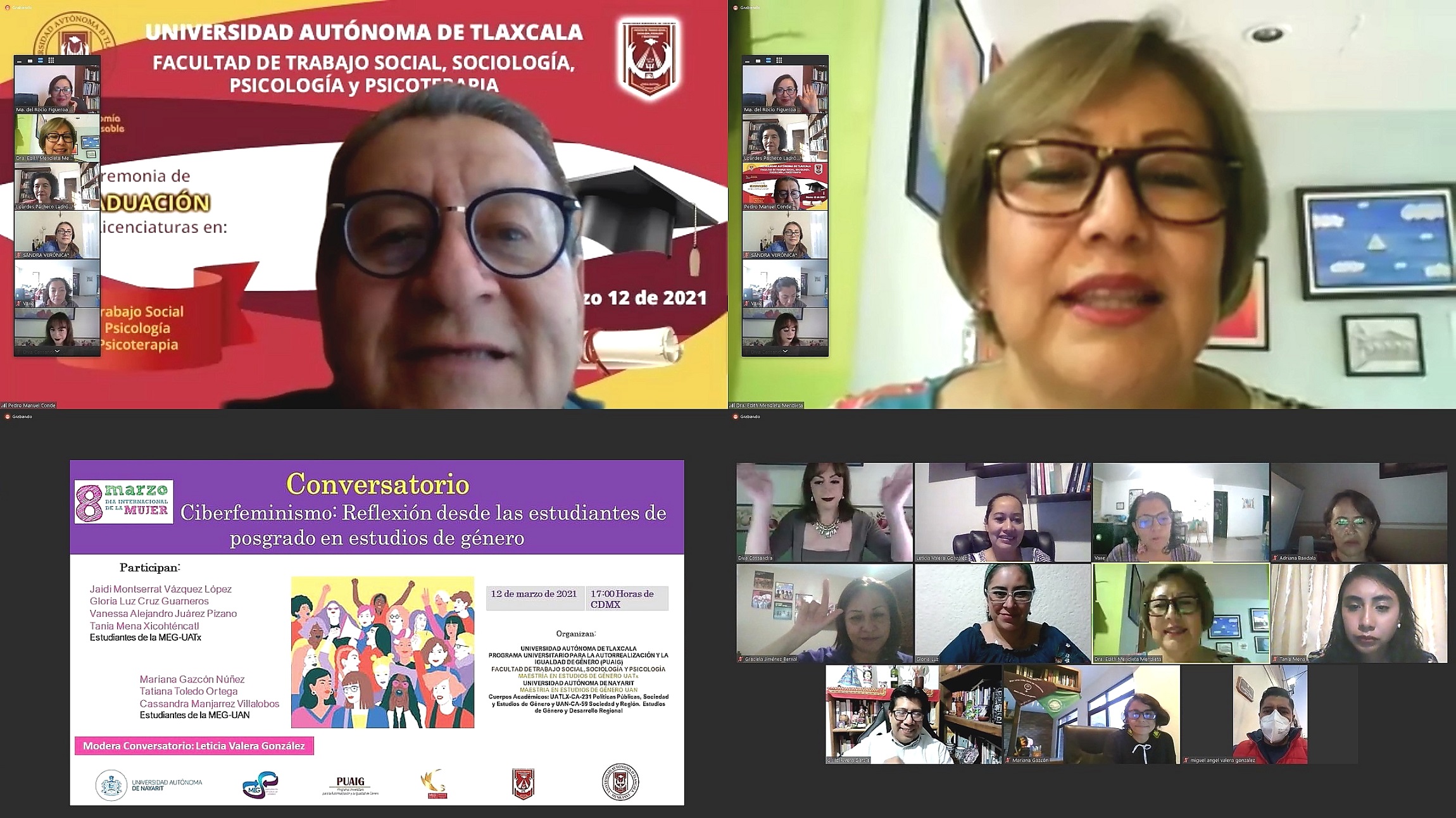 En este conversatorio, participaron por la UATx, las alumnas: Jaidi Monserrat Vázquez López, Gloria Luz Guarneros, Vanessa Alejandra Juárez Pizarro y Tania Mena Xicohténcatl; por la UAN: Mariana Gazcón Nuñez, Tatiana Toledo Ortega y Cassandra Manjarrez Villalobos, el cual fue moderado por la estudiante Leticia Valera González.
