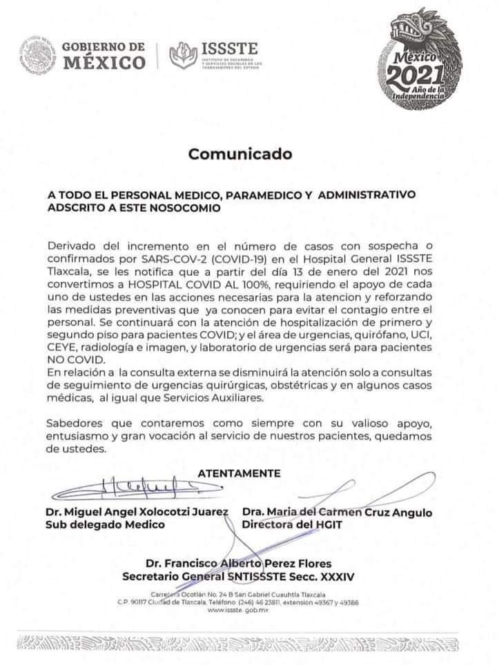 La dirección del nosocomio informó a través de un comunicado que a partir de ayer miércoles se convirtió al 100 por ciento en hospital COVID, por lo que llamó al personal médico a cumplir con las medidas de prevención necesarias y en su caso reforzarlas.