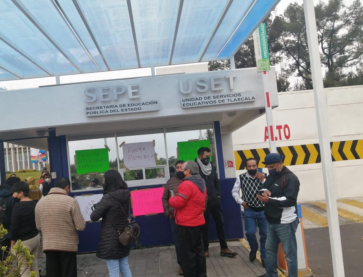 Tlaxcala, Tlax; 22 de junio de 2022 (Ariadna Castro) La mañana de este miércoles, docentes se manifestaron y tomaron las instalaciones de la Secretaría de Educación Pública del Estado y la Unidad de Servicios Educativos de Tlaxcala (SEPE-USET) como medida de presión para pedir la destitución del titular, Homero Meneses Hernández.
