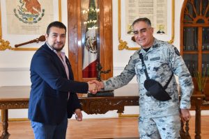 Huamantla, Tlax; 14 de julio de 2022 (PulsoRed) El alcalde Salvador Santos Cedillo, se reunió esta tarde en el despacho de la Presidencia Municipal con el Coordinador Estatal de la Guardia Nacional, el General de Brigadier DEM. Vinicio Perea Alcaraz, para abordar temas relacionados con la estrategia de seguridad que se implementará en la próxima Feria Internacional del Arte Efímero y la Dalia Huamantla 2022, para garantizar el orden y la paz social durante los festejos.
