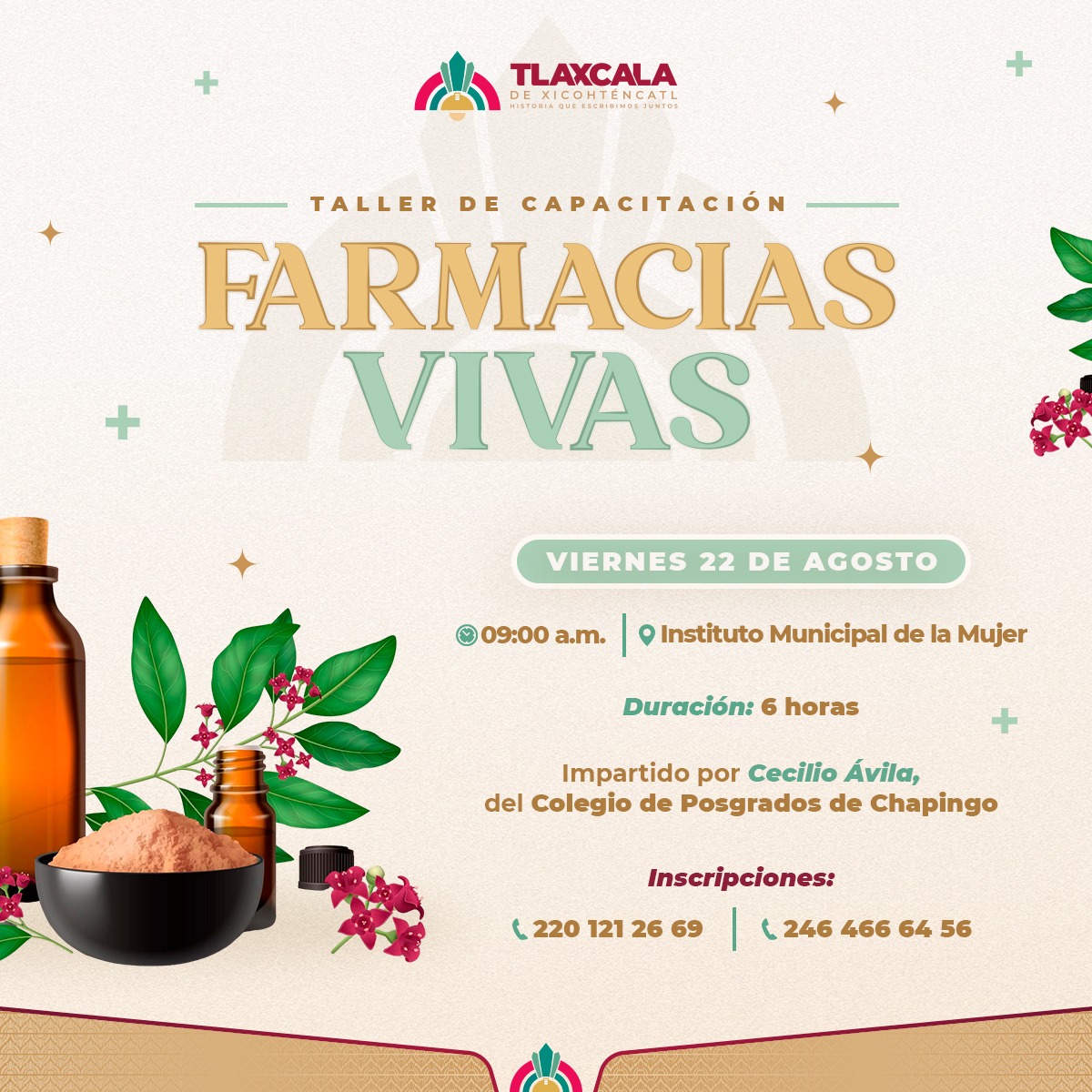 Tlaxcala, Tlax; 19 de agosto de 2025 (PulsoRed) Para fortalecer las oportunidades de desarrollo entre la ciudadanía, el Gobierno Municipal de Tlaxcala, que preside Alfonso Sánchez García, anunció la realización del Taller de Capacitación en Farmacias Vivas, dirigido a emprendedores, productores y público interesado en ampliar sus conocimientos en el manejo y aprovechamiento de plantas medicinales.
