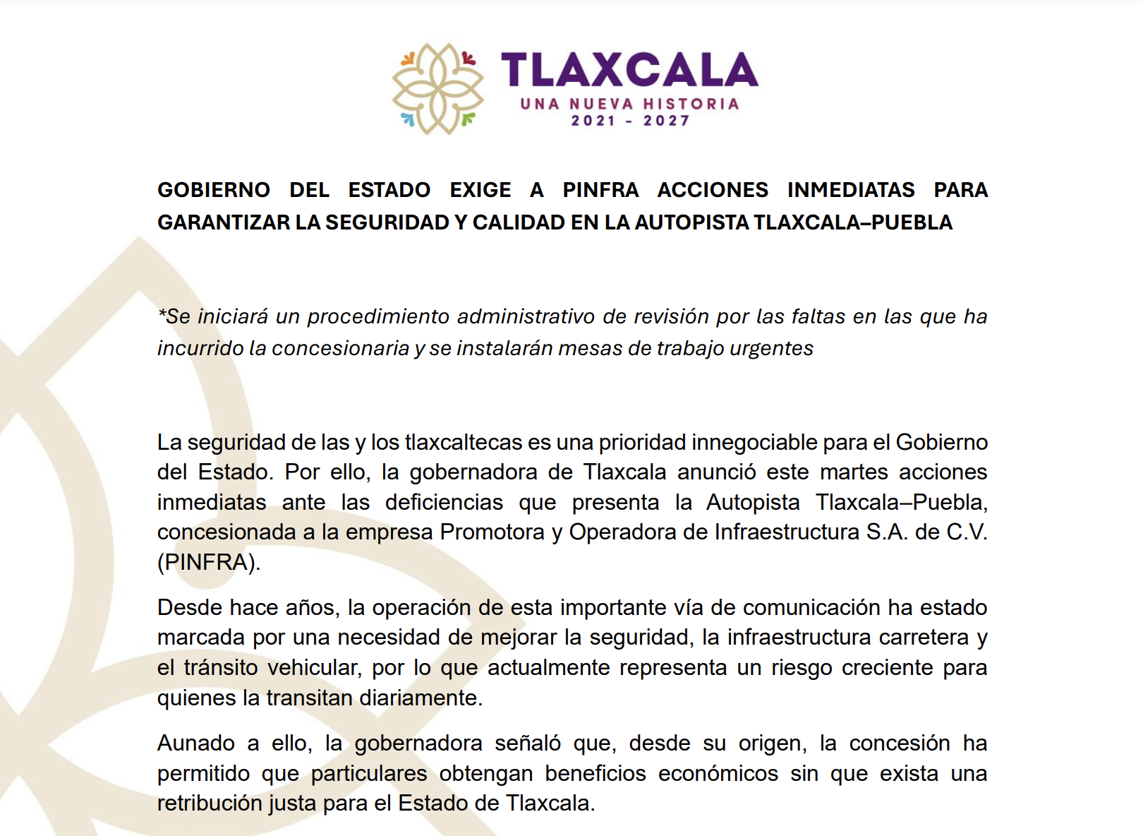 Tlaxcala, Tlax; 23 de abril de 2025 (PulsoRed) La seguridad de las y los tlaxcaltecas es una prioridad innegociable para el Gobierno del Estado. Por ello, la gobernadora de Tlaxcala anunció este martes acciones inmediatas ante las deficiencias que presenta la Autopista Tlaxcala–Puebla, concesionada a la empresa Promotora y Operadora de Infraestructura S.A. de C.V. (PINFRA).