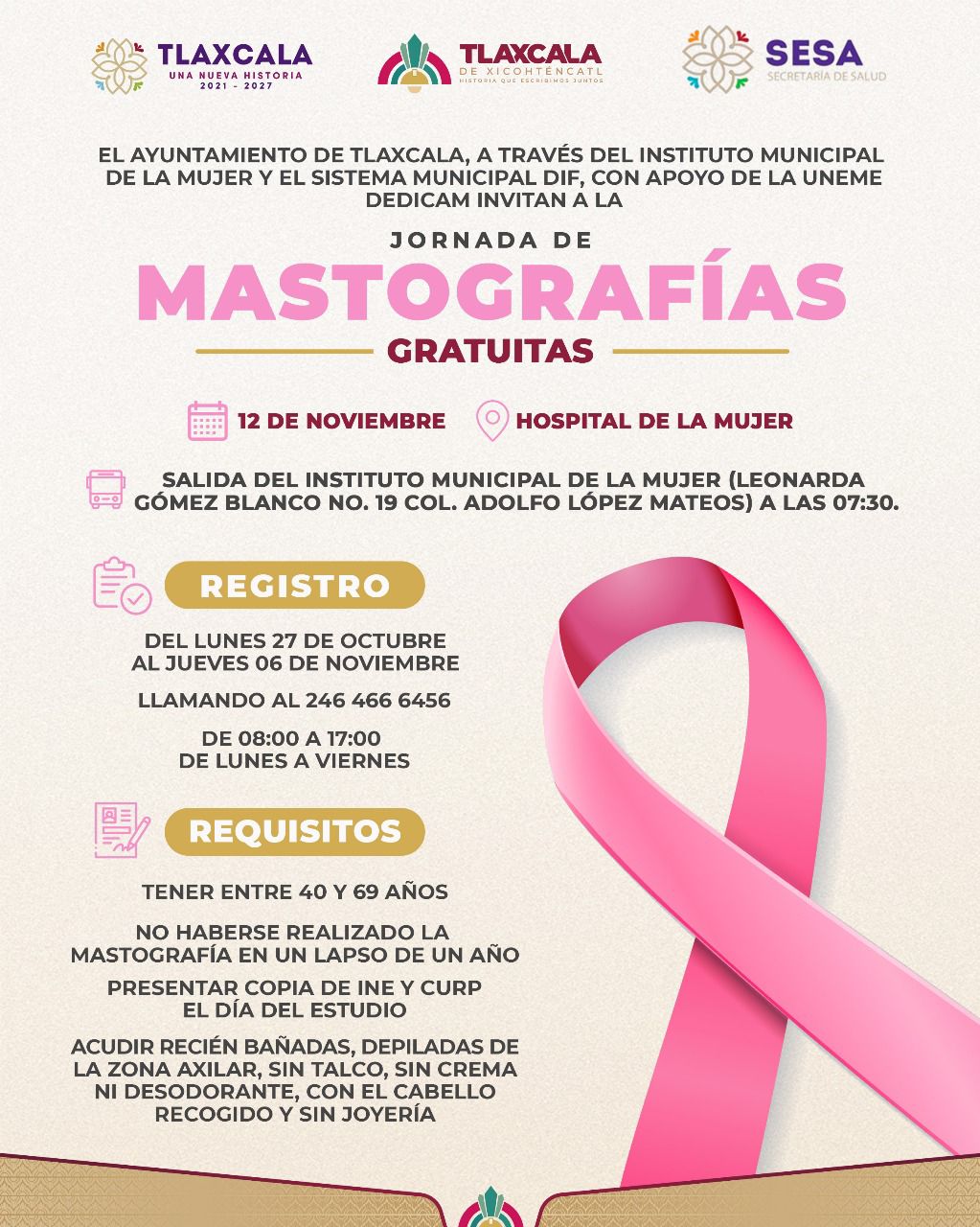 La jornada está dirigida a mujeres que no se hayan realizado una mastografía en el último año. El registro estará abierto hasta el 6 de noviembre y será vía telefónica al número 246 466 6456, en horario de 08:00 a 17:00 horas, de lunes a viernes.