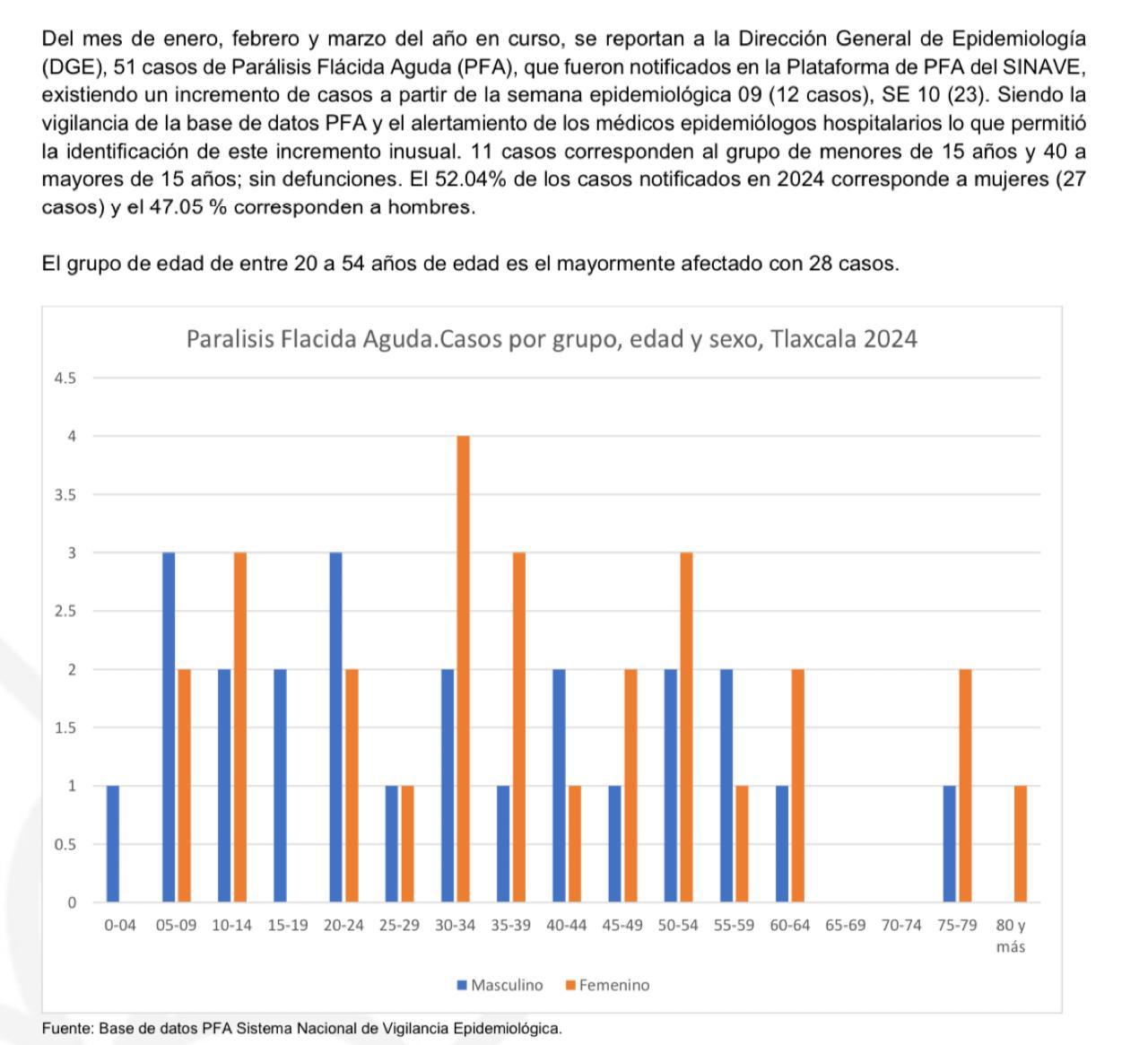 Esta Parálisis Flácida Aguda (PFA), misma que fue notificada en la Plataforma de PFA del Sistema Nacional de Vigilancia Epidemiológica (SINAVE) se presentó en 27 mujeres, representando el 52.04 por ciento de los casos y en 24 hombres, siendo el 47.05 por ciento de los pacientes.