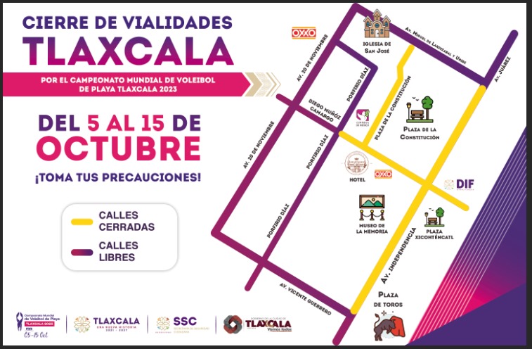 Tlaxcala, Tlax; 04 de octubre de 2023 (PulsoRed) La Secretaría de Seguridad Ciudadana (SSC), en coordinación con las Direcciones de Seguridad Pública Municipal de Tlaxcala, Apizaco y Huamantla, implementan un operativo vial con motivo del Campeonato Mundial de Voleibol de Playa Tlaxcala 2023.