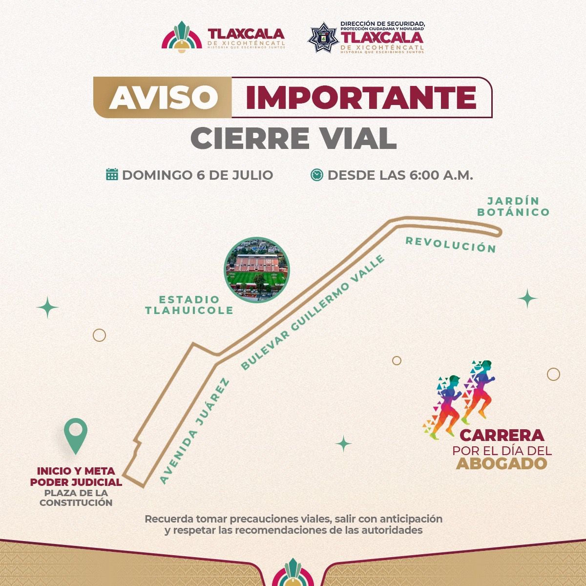 Tlaxcala, Tlax; 05 de julio de 2025 (PulsoRed) Para garantizar el orden y la seguridad vial durante la carrera conmemorativa del Día del Abogado, el Ayuntamiento de Tlaxcala implementará un operativo especial de vialidad este domingo 6 de julio en el primer cuadro de la ciudad, por lo que se cerrarán diversas vías, de ahí que se recomienda a la población en general tomar previsiones y rutas alternas durante el tiempo que dure este evento.