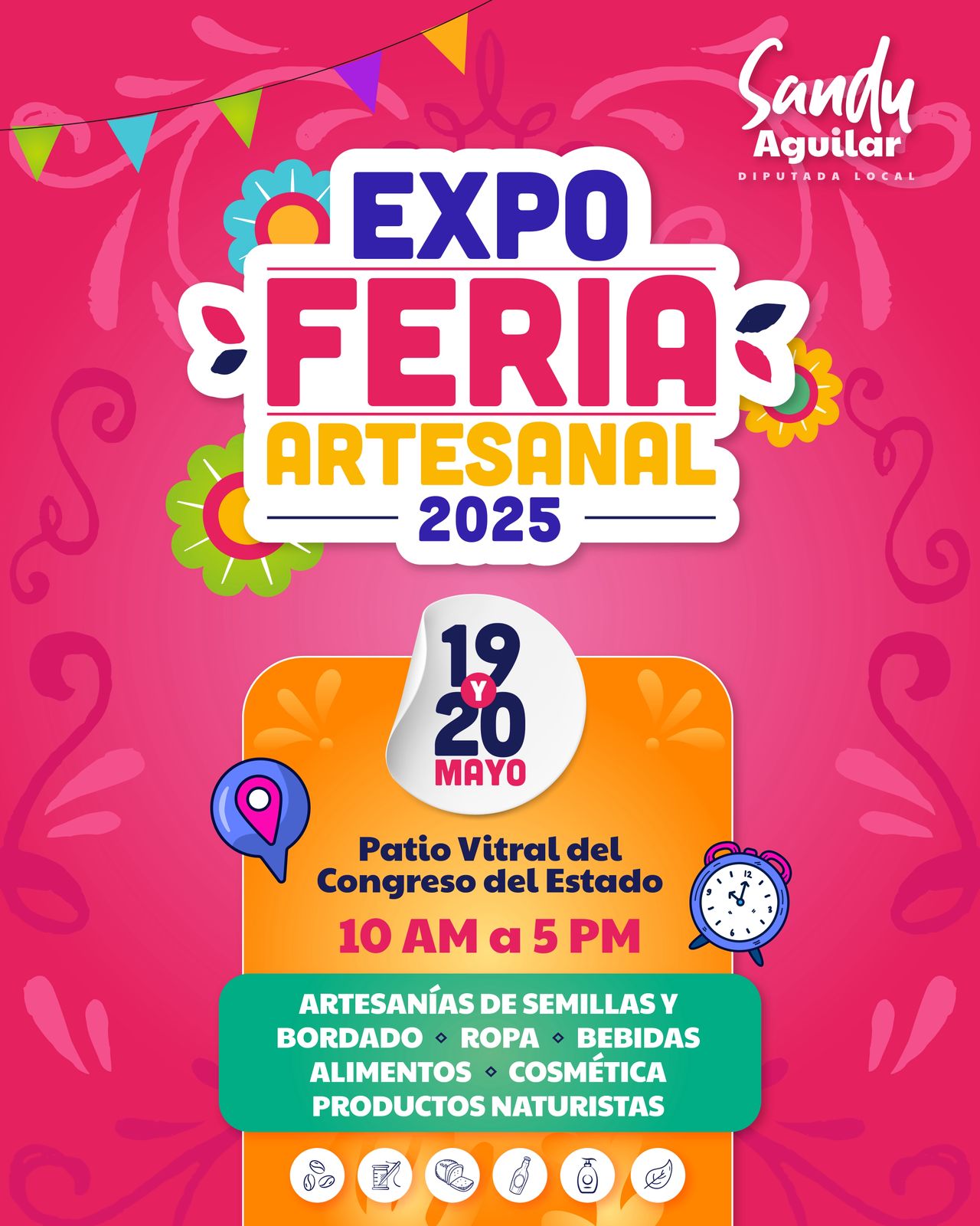 Tlaxcala, Tlax; 14 de mayo de 2025 (PulsoRed) Como parte de su compromiso para promover e impulsar el trabajo de artesanos y artesanas tlaxcaltecas, la diputada local del PRI, Sandra Aguilar Vega, llevará a cabo una Expo Feria Artesanal 2025 que tendrá lugar en el patio vitral de Congreso del Estado de Tlaxcala los días 19 y 20 de mayo.