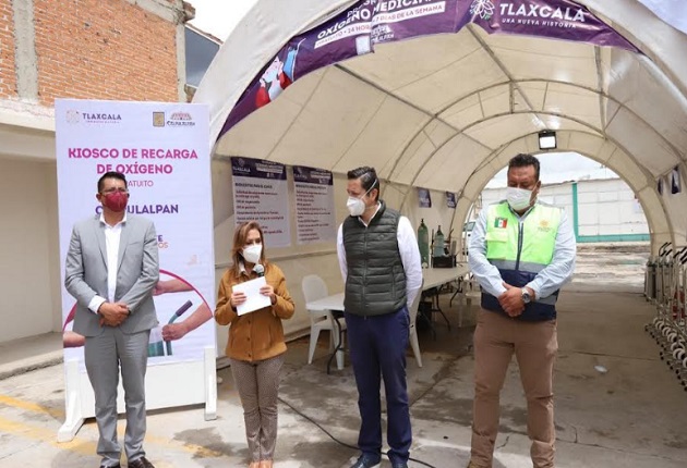 Tlaxcala, Tlax; 6 de septiembre de 2021 (Pulso) La gobernadora del estado de Tlaxcala, Lorena Cuéllar Cisneros inauguró este lunes el Kiosco de Recarga de Oxigeno Gratuito en el municipio de Calpulalpan, con la finalidad de apoyar a las familias tlaxcaltecas que tienen pacientes con Covid-19, pues se ahorrarán en promedio más de 15 mil pesos.