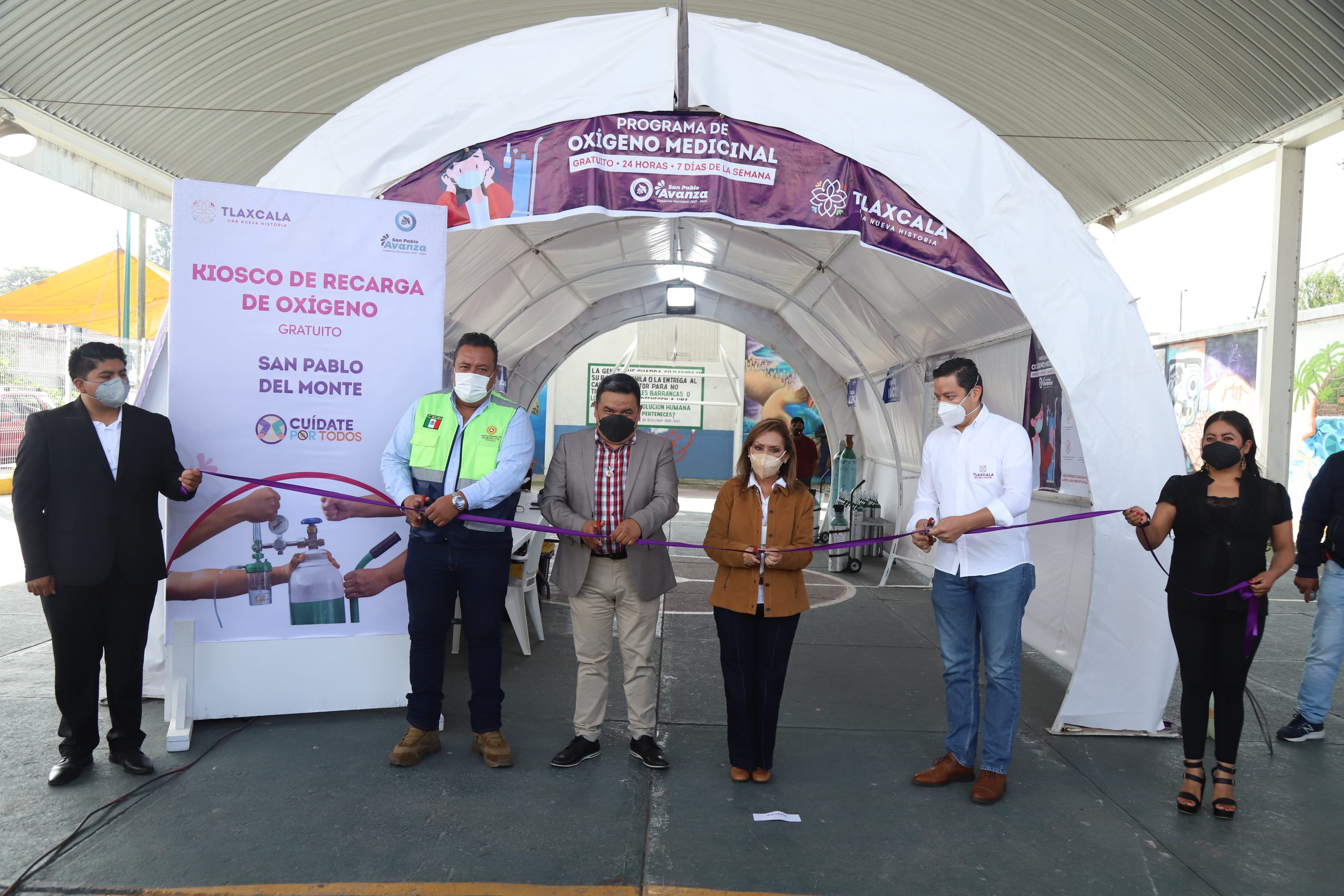 Tlaxcala, Tlax; 4 de septiembre de 2021 (Pulso) La gobernadora del estado, Lorena Cuéllar Cisneros inauguró los Kioscos de Recarga de Oxígeno Gratuito con una inversión inicial de 1.7 millones de pesos, que forma parte de la estrategia de apoyo y respaldo para combatir de manera inmediata el Covid-19 en la entidad.