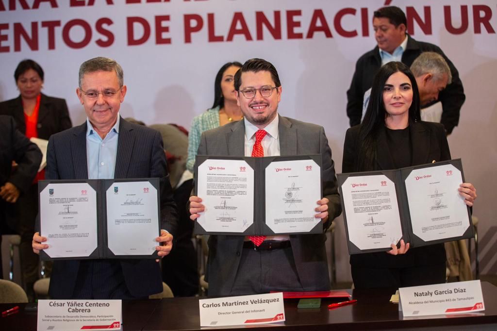 Además, “con esta firma, cada alcalde va a aportar tierra pública para el desarrollo de vivienda o se van a comprometer a adoptar facilidades fiscales que permitan el desarrollo de vivienda económica, y con esto ganamos todos, porque los beneficiarios del Infonavit podrán vivir en un municipio que tiene planeación, con vivienda segura, planeada y conectada con la parte de desarrollo industrial”.