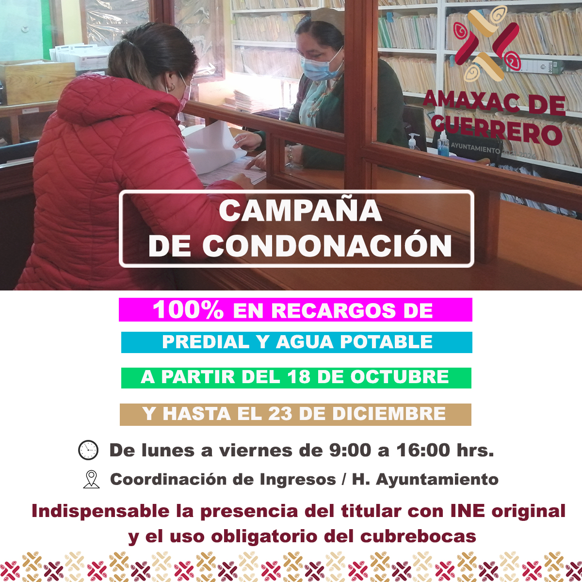 La campaña comenzará este lunes 18 de octubre y estará en vigor hasta el 23 de diciembre; por ello se invita a los interesados en aprovechar esta oportunidad para regularizarse, a que acudan al área de recaudación del ayuntamiento, en un horario de nueve de la mañana a cuatro de la tarde; recordándoles también que sigue siendo obligatorio el uso de cubrebocas en las instalaciones de la presidencia municipal.