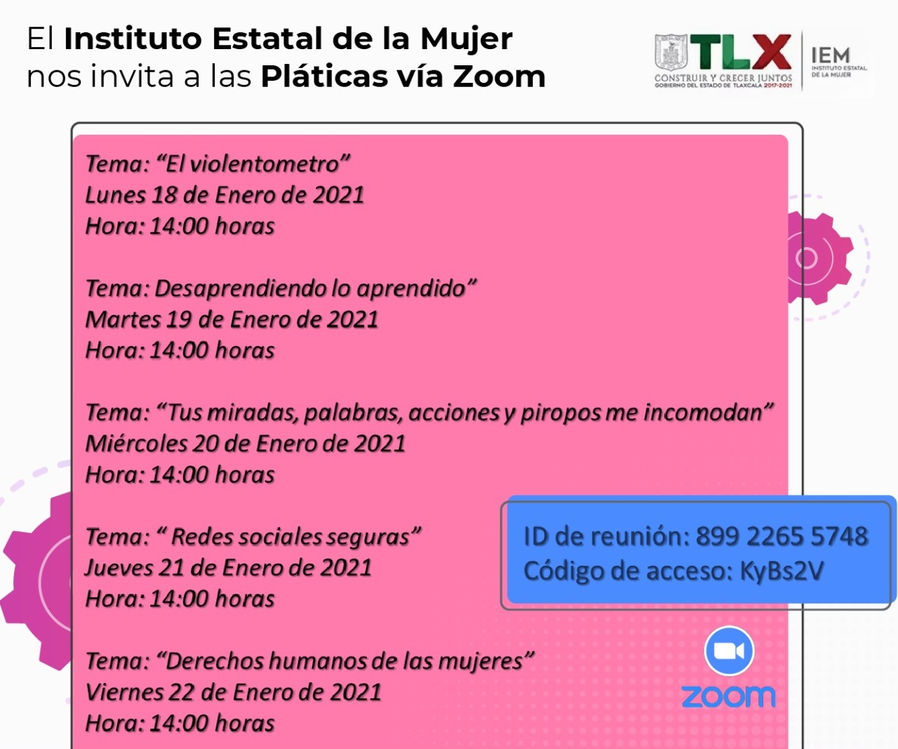Tlaxcala, Tlax; 18 de enero de 2021 (Pulso) Con el propósito de procurar entornos libres de violencia para las mujeres y difundir temas de interés para este sector de la población, el Instituto Estatal de la Mujer (IEM) inició el ciclo de conferencias virtuales, que se transmiten del 18 al 22 de enero a través de la plataforma Zoom.