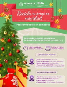 Tlaxcala, Tlax; 04 de enero de 2025 (PulsoRed) La Secretaría de Medio Ambiente del Estado (SMA) realizará la campaña “Recicla tu Árbol de Navidad” del 6 de enero al 24 de febrero 2025, con el objetivo de fomentar el reciclaje de los recursos naturales y la cultura ambiental por medio de la separación y reutilización de estos ejemplares en compostaje para la propagación de otras especies.