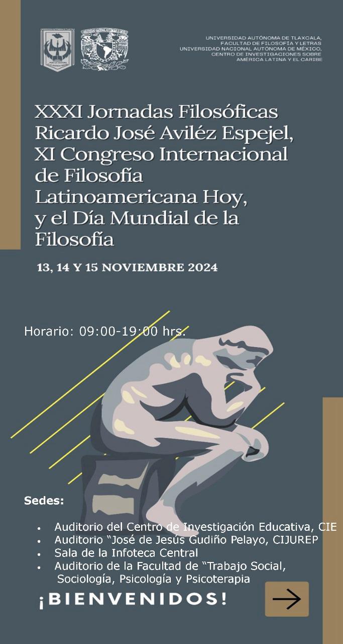 Tlaxcala, Tlax; 13 de noviembre de 2024 (PulsoRed) En una labor permanente a lo largo de 37 años para proyectar la importancia de la filosofía y fortalecer la formación de los estudiantes en este campo disciplinar, la Facultad de Filosofía y Letras de la Universidad Autónoma de Tlaxcala (UATx) celebrará las XXXI Jornadas Filosóficas “Ricardo José Avilez Espejel”, bajo el tema “Filosofía y responsabilidad social”, en el marco del IX Congreso de Filosofía Latinoamericana Hoy, evento que permite la discusión y el diálogo en torno a posiciones onto-epistémicas y filosóficas de acuerdo a los avances y retrocesos críticos que se están dando en América Latina, el Caribe y en el mundo.