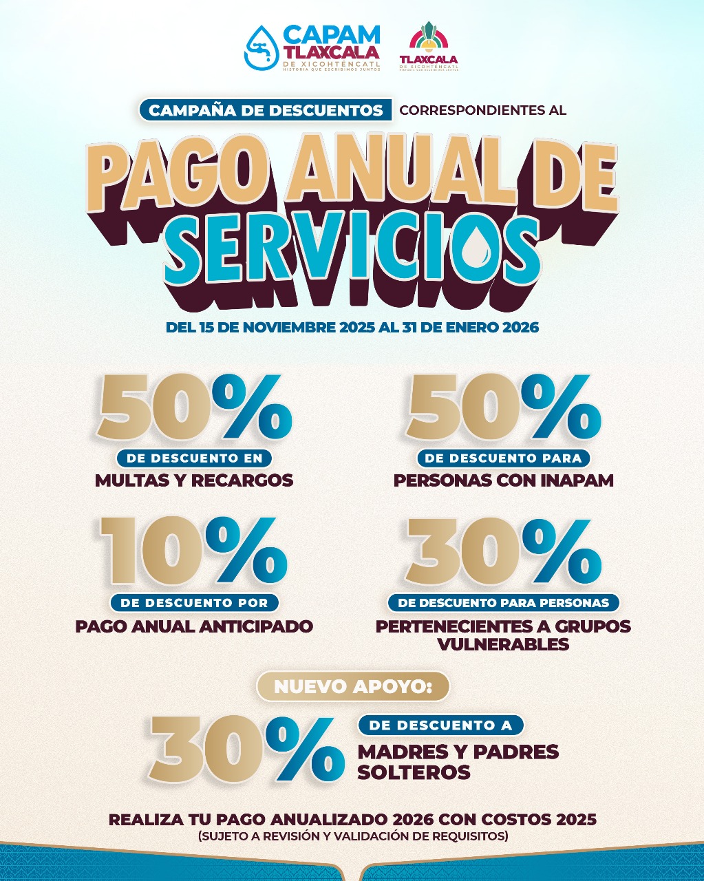 Sobre el tema, el alcalde Alfonso Sánchez García destacó que esta acción busca impactar de forma positiva la economía de los tlaxcaltecas, al ofrecer un 50 por ciento de descuento en multas y recargos, además de beneficios especiales en el pago anual a personas adultas mayores con credencial del INAPAM, con el objetivo de aliviar la carga económica y promover el cumplimiento responsable en los servicios municipales.
