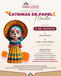 Tlaxcala, Tlax; 14 de julio de 2025 (PulsoRed) El Ayuntamiento de Tlaxcala, que preside Alfonso Sánchez García, a través del Instituto Municipal de la Mujer (IMM), invita a todas las mujeres interesadas de la capital a participar en el curso gratuito de “Catrinas de Papel Maché”, que se realizará del 7 de agosto al 25 de septiembre, con sesiones todos los jueves en un horario de 11:00 a 13:00 horas.