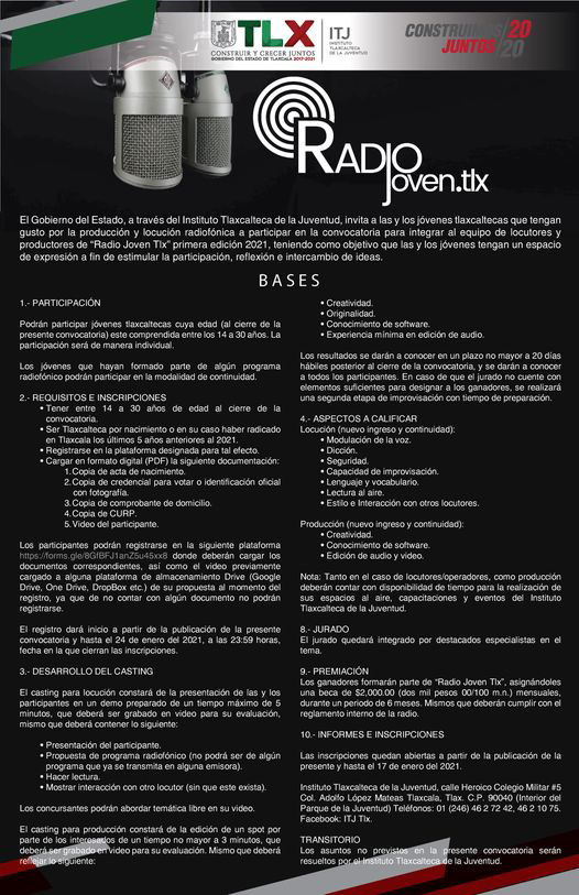 Tlaxcala, Tlax; 13 de enero de 2021 (Pulso) El Instituto Tlaxcalteca de la Juventud (ITJ) invita a las y los jóvenes tlaxcaltecas con gusto por la producción y locución radiofónica a participar en la convocatoria para integrar el equipo de locutores y productores de “Radio Joven Tlx” primera edición 2021.