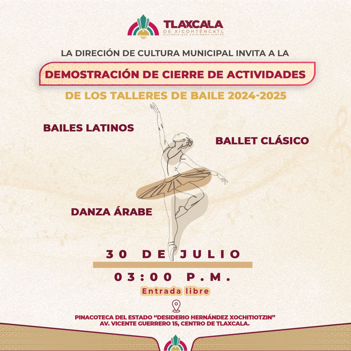 Tlaxcala, Tlax; 28 de julio de 2025 (PulsoRed) El Ayuntamiento del Municipio de Tlaxcala, a través de la Dirección de Cultura, hace una atenta invitación al público en general para asistir a la “Demostración de cierre de actividades de los talleres de baile 2024-2025”, donde las y los alumnos de bailes latinos, ballet clásico y danza árabe presentarán el resultado de su dedicación y aprendizaje.