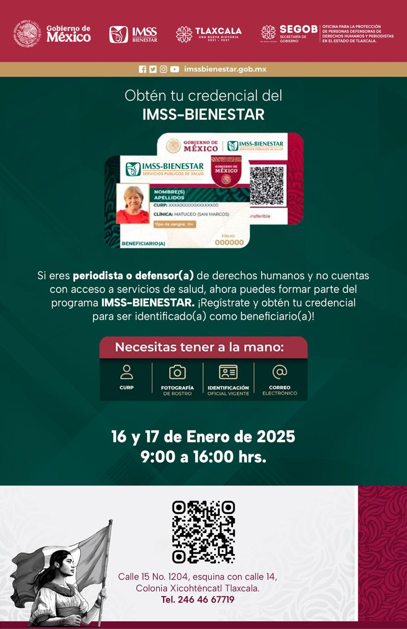 Tlaxcala, Tlax; 15 de enero de 2025 (PulsoRed) La Secretaría de Gobierno del estado (Segob), a través de la oficina para la protección de personas defensoras de derechos humanos y periodistas, en coordinación con el IMSS-Bienestar, pondrá en marcha la Jornada de Credencialización dirigida a comunicadores y defensores que no cuenten con seguridad social.