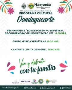 Huamantla, Tlax; 4 de marzo de 2023 (PulsoRed) El H. Ayuntamiento de Huamantla, a través de la Coordinación de Cultura, invita a la ciudadanía en general este 5 de marzo a disfrutar de la cartelera que se tiene preparada en el programa “Dominguearte”.