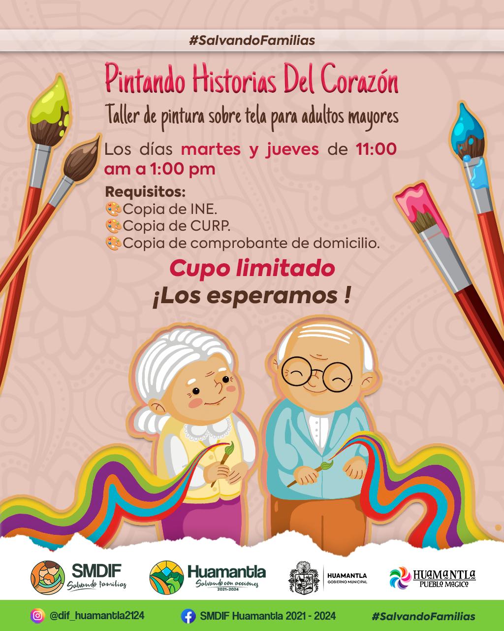 Huamantla, Tlax; 21 de septiembre de 2023 (PulsoRed) Con la finalidad de ofrecer actividades de entretenimiento y aprendizaje, el Sistema Municipal para el Desarrollo Integral de la Familia (SMDIF) Huamantla, invita a los adultos mayores del municipio al taller denominado “Pintando Historias del Corazón”, que se impartirá de manera gratuita a partir de este martes 26 de septiembre.