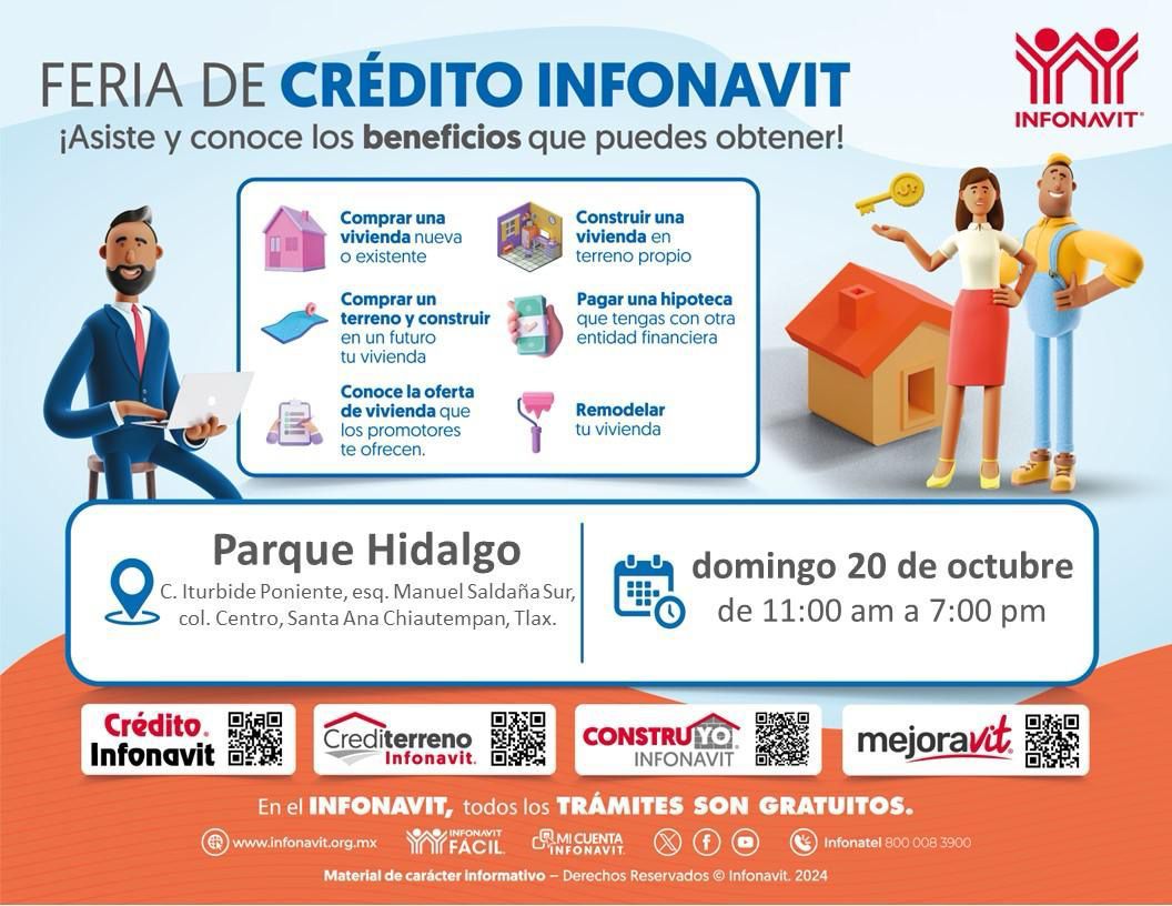 Chiautempan, Tlax; 19 de octubre de 2024 (PulsoRed) El Gobierno Municipal de Chiautempan, en colaboración con el Instituto del Fondo Nacional de la Vivienda para los Trabajadores (Infonavit), invita a todas las y los derechohabientes a participar en la Feria de Crédito Infonavit, la cual tiene el propósito de acercar los diferentes productos de financiamiento a la ciudadanía.