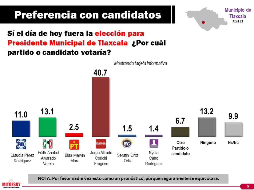“Más allá de sus preferencias ¿qué partido o candidato cree que ganará la elección para Presidente Municipal de Tlaxcala?, se preguntó en la encuesta. El 37% eligieron a Jorge Corichi, el 13.7% a Anabel Alvarado y el 13.6% a Claudia Pérez.