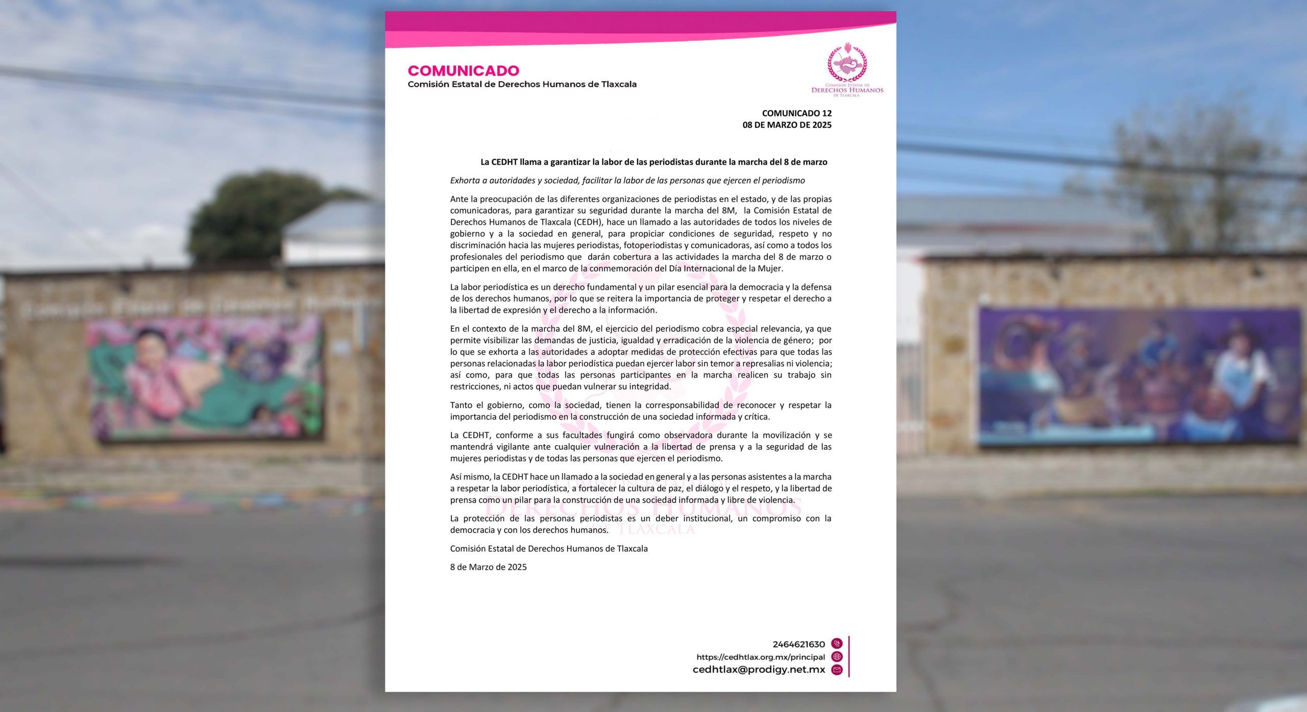 Tlaxcala, Tlax; 08 de marzo de 2025 (PulsoRed) Ante la preocupación de las diferentes organizaciones de periodistas en el estado, y de las propias comunicadoras, para garantizar su seguridad durante la marcha del 8M, la Comisión Estatal de Derechos Humanos de Tlaxcala (CEDH), hace un llamado a las autoridades de todos los niveles de gobierno y a la sociedad en general, para propiciar condiciones de seguridad, respeto y no discriminación hacia las mujeres periodistas, fotoperiodistas y comunicadoras, así como a todos los profesionales del periodismo que darán cobertura a las actividades la marcha del 8 de marzo o participen en ella, en el marco de la conmemoración del Día Internacional de la Mujer.