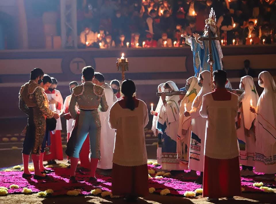 La corrida se realiza de forma tradicional, el plus añadido es el ritual religioso que antecede el festejo taurino. El ruedo es adornado con un tapete multicolor alusivo a la ocasión. Se apagan las luces y se ilumina el recinto con veladoras que el público asistente porta. Aparece la Virgen de la Caridad, acompañado por los matadores actuantes, cuadrillas, monosabios y presbíteros. A manera de procesión, se da una vuelta al ruedo en compañía de la nota musical Ave María. Tras ello, se concentran en el centro del redondel, donde el matador tlaxcalteca anunciado en el cartel reza la oración de los toreros, no sin antes contar con una participación previa del obispo que dirige unas palabras y realiza una plegaria.
