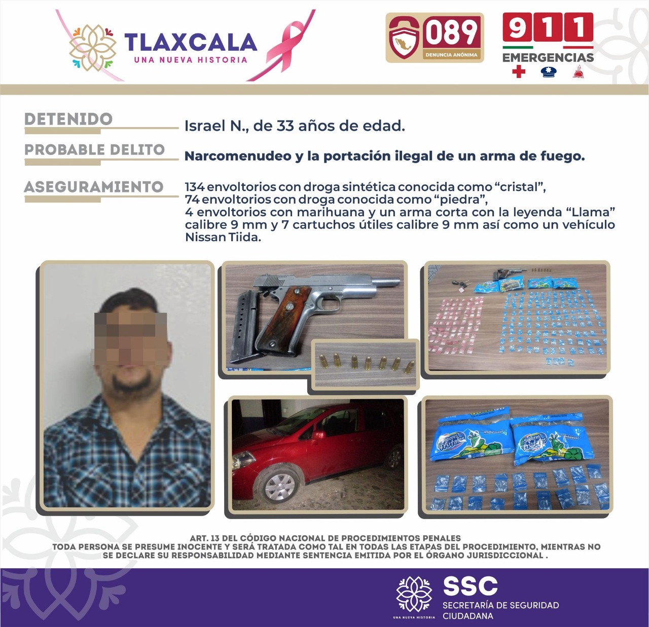 Tlaxcala, Tlax; 28 de octubre de 2021 (Pulso) La Secretaría de Seguridad Ciudadana (SSC) mediante acciones estratégicas para el combate y prevención de los delitos en el estado, detuvo en el municipio de Calpulalpan a una persona, presunta responsable de cometer delitos contra la salud en su modalidad de narcomenudeo; así como por la portación ilegal de un arma de fuego.Personal de la Dirección de Policía Estatal de Caminos y Vialidad detectaron en las inmediaciones del boulevard Emilio Sánchez Piedras de la colonia Esmeralda a una persona que conducía de forma imprudente un vehículo Tiida de la marca Nissan, cometiendo una infracción al Reglamento de la Ley de Comunicaciones y Transportes en el Estado en Materia de Transporte Público y Privado; por lo que la unidad fue interceptada a fin de prevenir algún percance y proceder a la respectiva amonestación del conductor.