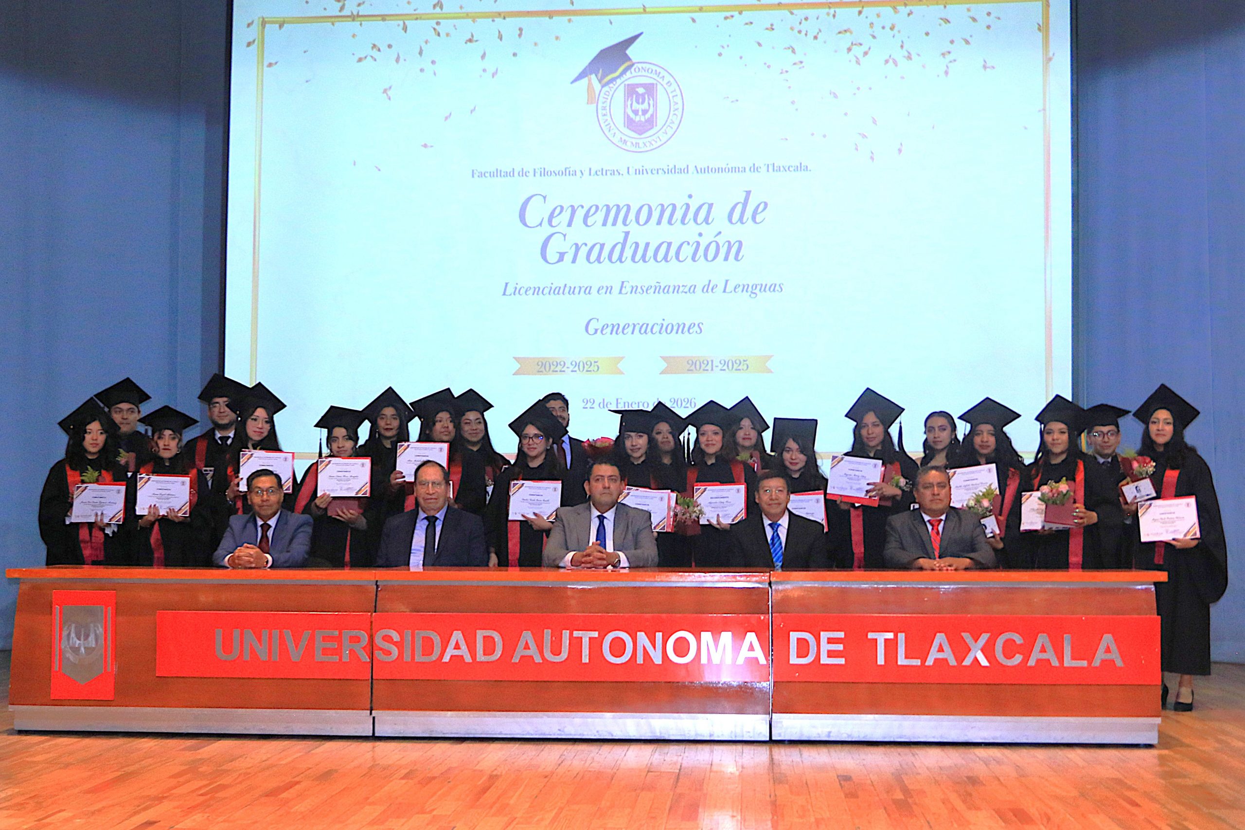 Tlaxcala, Tlax; 25 de enero de 2026 (PulsoRed) Los profesionales en la Enseñanza de Lenguas favorecen la comunicación, el entendimiento entre personas y la vinculación entre contextos diversos, lo cual quedó de manifiesto en la ceremonia de graduación de 40 estudiantes, generaciones 2021-2025 y 2022-2025, de la Licenciatura en Enseñanza de Lenguas de la Facultad de Filosofía y Letras de la Universidad Autónoma de Tlaxcala (FFyL-UATx).