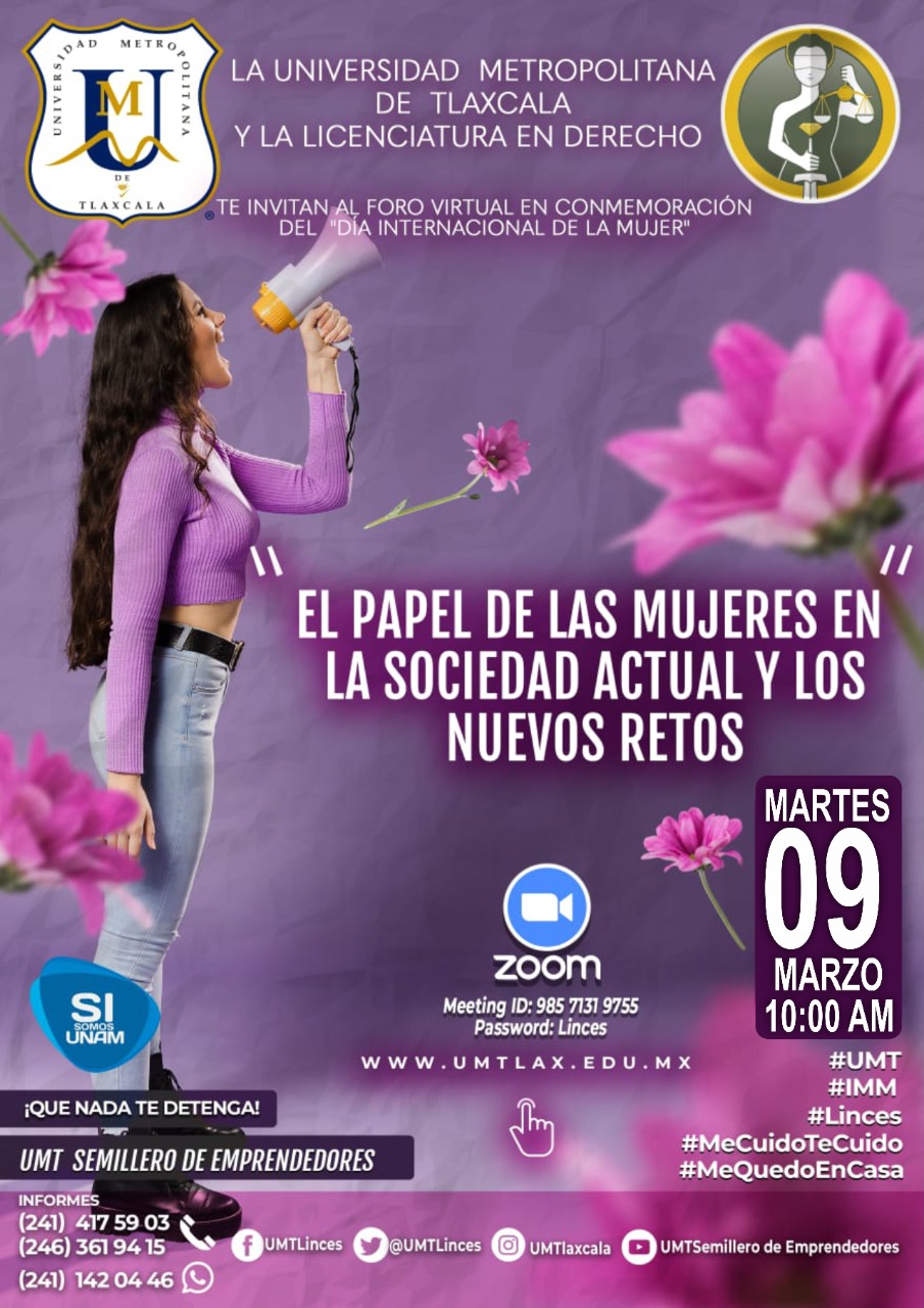 Twitter La #UMT y la licenciatura en #Derecho te invitan al foro virtual «El papel de las mujeres en la sociedad actual y los nuevos retos» Martes 09 de Marzo, 2021 10:00A.M. Unirse a la reunión Zoom https://zoom.us/j/98571319755… ID de reunión: 985 7131 9755 Código de acceso: Linces Navegación de entradas Confirma SESA 5 defunciones y 45 casos positivos de Covid-19 Supervisa RLM remodelación de la escuela de talentos