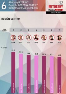 Tlaxcala, Tlax; 18 de septiembre de 2025 (PulsoRed) En la región centro del país, Lorena Cuéllar Cisneros figuró como la tercera mandataria estatal con más respaldo ciudadano. Además, se mantiene como la quinta gobernadora mejor evaluada del país, y como la quinta gobernante afín a la Cuarta Transformación con mayor calificación, en el Ranking de Gobernadores y Gobernadoras de México, correspondiente al mes de agosto de 2025, realizado por Consulta Mitofsky.