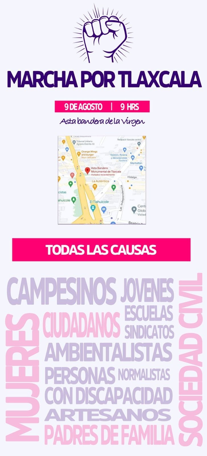 Tlaxcala, Tlax; 08 de agosto de 2023 (Selene Sosa) Como este medio dio a conocer, la semana anterior, activistas y sociedad civil organizada convocaron a participar en una “mega marcha” en donde “todas las causas entran”, por lo que recientemente anunciaron tener todo listo para la realización de dicha movilización.
