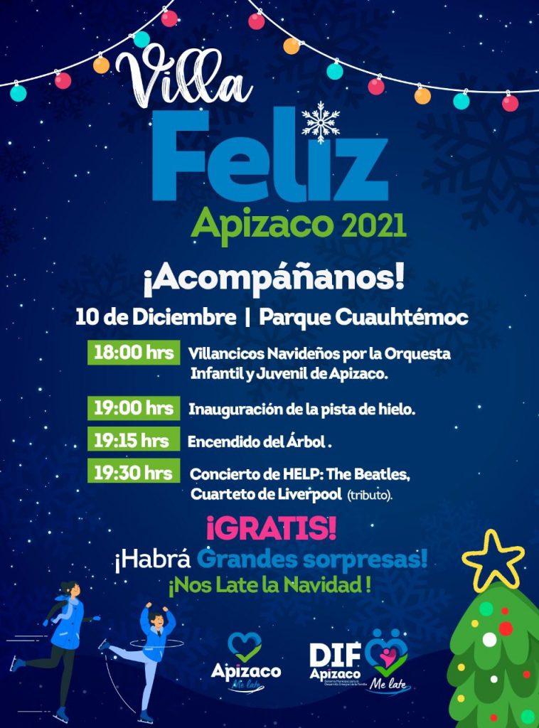 A las 18:00 horas, arranca el cartel con la presentación de Villancicos Navideños a cargo de la orquesta infantil y juvenil de Apizaco, y una hora más tarde quedará inaugurada una pista de hielo que se ubicará en el parque Cuauhtémoc del centro de la ciudad, completamente gratis