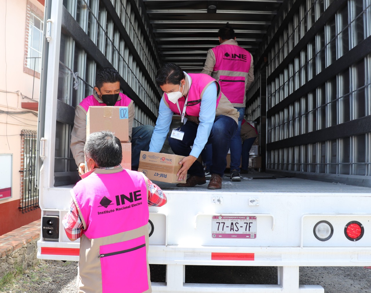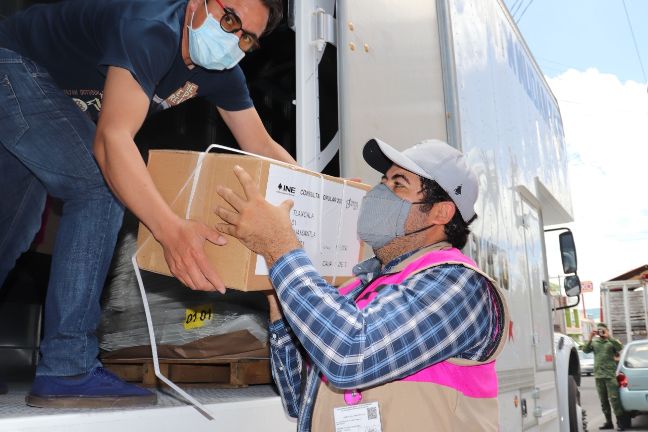 El primer punto al que arribó el camión con los insumos para la Consulta, proveniente de la Ciudad de México, fue el distrito federal 03, cuya sede es Zacatelco, donde fueron desembarcadas 56 cajas con papeletas para un total de 326 mil 828 ciudadanas y ciudadanos, así como mil 775 piezas de documentación de la Consulta.