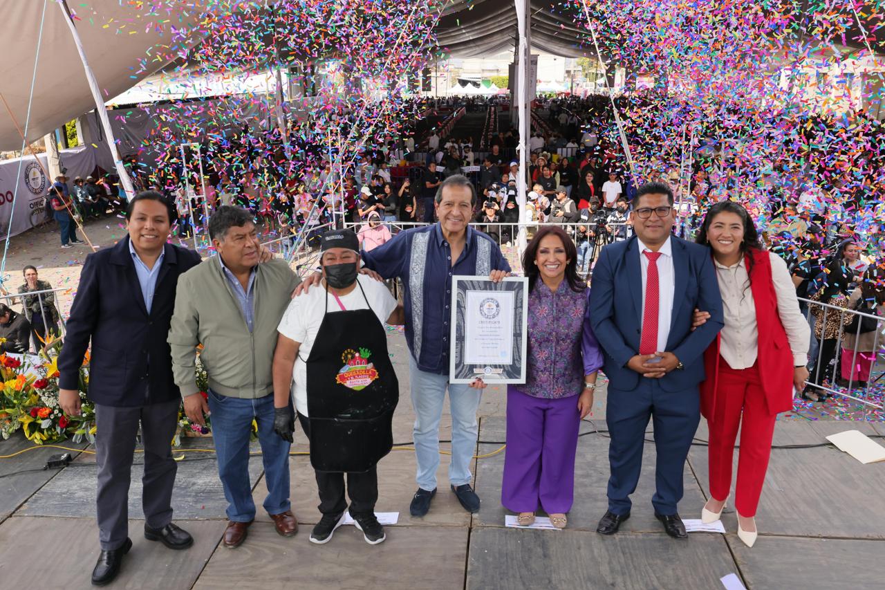 Tlaxcala, Tlax; 07 de marzo de 2026 (PulsoRed) Tlaxcala logró el nuevo título mundial de Récord Guinness por “la línea de quesadillas más grande del mundo”, en el marco de la inauguración de la Feria de la Quesadilla y el Tlacoyo 2026, en Santa Ana Nopalucan, reconocimiento que recibieron la gobernadora Lorena Cuéllar Cisneros y el presidente municipal Pedro Pérez Vázquez de manos de la adjudicadora oficial de Guinness World Records para América, Susana Reyes.